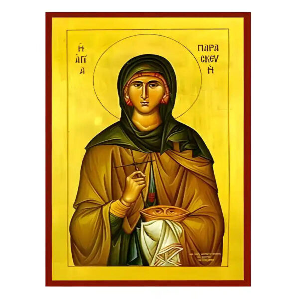 Βασικά Χαρακτηριστικά: – Σχέδιο: Κλασική βυζαντινή εικονογραφία με ζωηρό κόκκινο περίγραμμα – Υλικό: Ξύλο Μασίφ Φλαμουρία υψηλής αντοχής με προστατευτικό βερνίκι για ποιότητα που διαρκεί – Προέλευση: Χειροποίητο στην Ελλάδα – Σκοπός: Ιδανικό για γωνιές προσευχής, εκκλησίες, διακόσμηση σπιτιού ή ως δώρο με νόημα Διαθέσιμα μεγέθη: 10×7 cm (3,9 x 2,8 ίντσες) 15×11 cm (5,9 x 4,3 ίντσες) 21×15 cm (8,3 x 5,9 ίντσες) 26×20 cm (10,2 x 7,9 ίντσες) 40×30 cm (15,8 x 11,8 ίντσες) 45×35 cm (17,7 x 13,8 ίντσες) 50×40 cm (19,7 x 15,8 ίντσες)► Εικόνα της Αγίας  Παρασκευής χρυσή, ξύλινη.  Χειροποίητη ξύλινη εικόνα, ειδικής επεξεργασίας  σε σκληρό Φλαμουριά Ξύλο Εικόνα Ορθόδοξης τέχνης, σκαλισμένη ή τυπωμένη σε ξύλο φλαμουριάς υψηλής ποιότητας. Η φυσική απαλότητα και ομοιομορφία του ξύλου τονίζει κάθε λεπτομέρεια του εικονίσματος, αναδεικνύοντας τη βαθιά πνευματικότητα και την ιερότητα της παράδοσης. Ιδανική για οικιακό εικονοστάσι, δώρο βάπτισης, γάμου ή αφιέρωμα σε ναό. Το ξύλο έχει υποστεί ειδική επεξεργασία για αντοχή και αισθητική αρμονία, κρατώντας ζωντανά τα χρώματα και τη μορφή του προσώπου του Αγίου. με ανεξίτηλα χρώματα σε λεπτό καμβά.