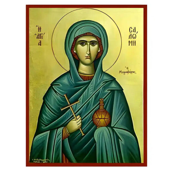 Η Αγία Σαλώμη ήταν συγγενής της Παναγίας, σύζυγος του Ζεβεδαίου και μητέρα των Αποστόλων Ιακώβου και Ιωάννη. Παρευρέθη στη Σταύρωση του Χριστού και ήταν μία από τις γυναίκες που άλειψαν με μύρο το σώμα Του. Μετά την ίδρυση της πρώτης χριστιανικής Εκκλησίας στα Ιεροσόλυμα, η Σαλώμη διακρίθηκε για τον χριστιανικό της ζήλο και τις ελεημοσύνες προς τους συνανθρώπους της. Απεβίωσε εν ειρήνη.
