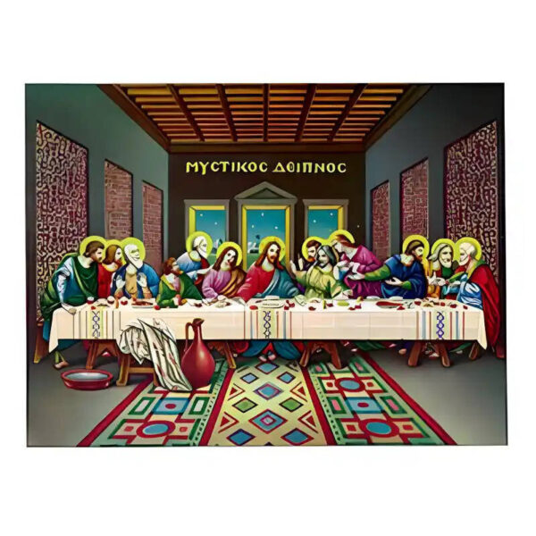 Βασικά Χαρακτηριστικά: – Σχέδιο: Κλασική βυζαντινή εικονογραφία με ζωηρό κόκκινο περίγραμμα – Υλικό: Ξύλο Μασίφ Φλαμουρία υψηλής αντοχής με προστατευτικό βερνίκι για ποιότητα που διαρκεί – Προέλευση: Χειροποίητο στην Ελλάδα – Σκοπός: Ιδανικό για γωνιές προσευχής, εκκλησίες, διακόσμηση σπιτιού ή ως δώρο με νόημα Διαθέσιμα μεγέθη: 10×7 cm (3,9 x 2,8 ίντσες) 15×11 cm (5,9 x 4,3 ίντσες) 21×15 cm (8,3 x 5,9 ίντσες) 26×20 cm (10,2 x 7,9 ίντσες) 40×30 cm (15,8 x 11,8 ίντσες) 45×35 cm (17,7 x 13,8 ίντσες) 50×40 cm (19,7 x 15,8 ίντσες)► Εικόνα του Μυστικού Δείπνου ξύλινη.  Χειροποίητη ξύλινη εικόνα, ειδικής επεξεργασίας σε σκληρό Φλαμουριά Ξύλο Εικόνα Ορθόδοξης τέχνης, σκαλισμένη ή τυπωμένη σε ξύλο φλαμουριάς υψηλής ποιότητας. Η φυσική απαλότητα και ομοιομορφία του ξύλου τονίζει κάθε λεπτομέρεια του εικονίσματος, αναδεικνύοντας τη βαθιά πνευματικότητα και την ιερότητα της παράδοσης. Ιδανική για οικιακό εικονοστάσι, δώρο βάπτισης, γάμου ή αφιέρωμα σε ναό. Το ξύλο έχει υποστεί ειδική επεξεργασία για αντοχή και αισθητική αρμονία, κρατώντας ζωντανά τα χρώματα και τη μορφή του προσώπου του Αγίου. με ανεξίτηλα χρώματα σε λεπτό καμβά.