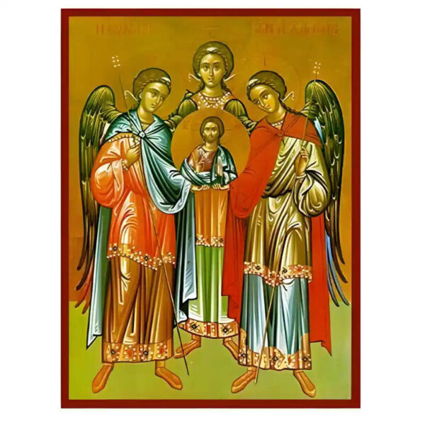 Εικόνα Ορθοδοξίας με περίγραμμα χρυσό σε ξύλο Φλαμουρίας με βάση Εικόνα Σύναξη Αρχαγγέλων Μιχαήλ, Γαβριήλ και Ραφαήλ Χειροποίητη Ελληνορθόδοξη , Κρεμαστή πλάκα βυζαντινής τέχνης, χριστιανική τέχνη Διάσταση 40×30 cm (15,8 x 11,8 ίντσες) INTRAEK-294670400