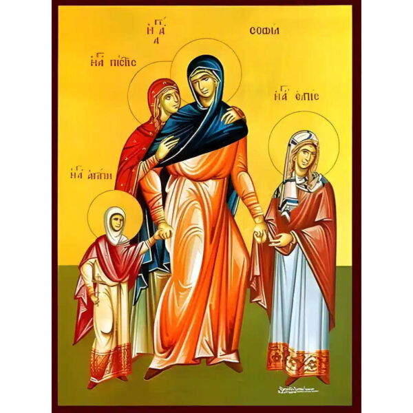 Εικόνα Ορθοδοξίας με περίγραμμα χρυσό σε ξύλο Φλαμουρίας με βάση Εικόνα ΑΓΙΕΣ ΣΟΦΙΑ ΚΑΙ ΘΥΓΑΤΕΡΕΣ, ΠΙΣΤΙΣ, ΕΛΠΙΣ ΚΑΙ ΑΓΑΠΗ, ΟΛΟΣΩΜΕΣ Χειροποίητη Ελληνορθόδοξη εικόνα του Ιησού Χριστού, Κρεμαστή πλάκα βυζαντινής τέχνης, χριστιανική τέχνη Διάσταση 40×30 cm (10,2×7,9 ίντσες) INTRAEK-1447757865198