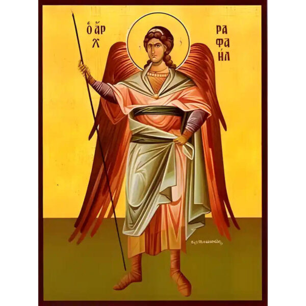 Εικόνα Ορθοδοξίας με περίγραμμα χρυσό σε ξύλο Φλαμουρίας με βάση Εικόνα ΑΡΧΑΓΓΕΛΟΣ ΡΑΦΑΗΛ, ΟΛΟΣΩΜΟΣ Χειροποίητη Ελληνορθόδοξη εικόνα του Ιησού Χριστού, Κρεμαστή πλάκα βυζαντινής τέχνης, χριστιανική τέχνη Διάσταση 15×11 cm (5,9×4,3 ίντσες) INTRAEK-337757864475