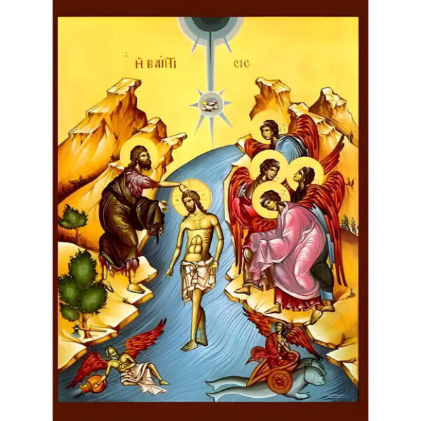 Εικόνα Ορθοδοξίας με περίγραμμα χρυσό σε ξύλο Φλαμουρίας με βάση Εικόνα ΒΑΠΤΙΣΙΣ ΧΡΙΣΤΟΥ Χειροποίητη Ελληνορθόδοξη εικόνα του Ιησού Χριστού, Κρεμαστή πλάκα βυζαντινής τέχνης, χριστιανική τέχνη Διάσταση 15×11 cm (5,9×4,3 ίντσες) INTRAEK-337757864469