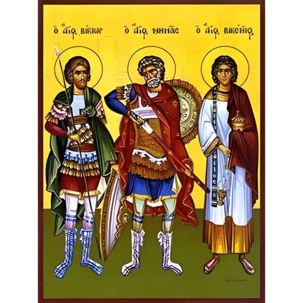 Εικόνα Ορθοδοξίας με περίγραμμα χρυσό σε ξύλο Φλαμουρίας με βάση Εικόνα ΑΓΙΟΙ ΒΙΚΤΩΡ ΔΑΜΑΣΚΟΥ, ΜΗΝΑΣ ΑΙΓΥΠΤΟΥ ΚΑΙ ΒΙΚΕΝΤΙΟΣ ΙΣΠΑΝΙΑΣ, ΟΛΟΣΩΜΟΙ Χειροποίητη Ελληνορθόδοξη εικόνα του Ιησού Χριστού, Κρεμαστή πλάκα βυζαντινής τέχνης, χριστιανική τέχνη Διάσταση 40×30 cm (10,2×7,9 ίντσες) INTRAEK-1447757865180