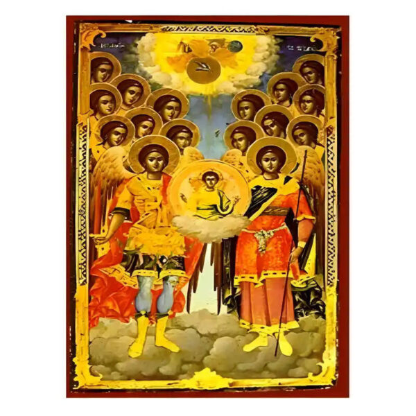 Εικόνα Ορθοδοξίας με περίγραμμα χρυσό σε ξύλο Φλαμουρίας με βάση Εικόνα Σύναξη Ταξιαρχών Χειροποίητη Ελληνορθόδοξη , Κρεμαστή πλάκα βυζαντινής τέχνης, χριστιανική τέχνη Διάσταση 10×7 cm (3,9 x 2,8 ίντσες) INTRAEK-670936