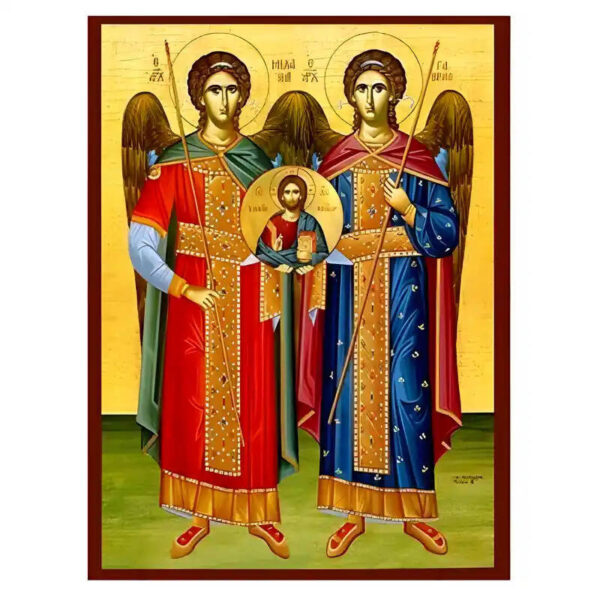 Εικόνα Ορθοδοξίας με περίγραμμα χρυσό σε ξύλο Φλαμουρίας με βάση Εικόνα Σύναξη Αρχαγγέλων Μιχαήλ και Γαβριήλ Χειροποίητη Ελληνορθόδοξη , Κρεμαστή πλάκα βυζαντινής τέχνης, χριστιανική τέχνη Διάσταση 10×7 cm (3,9 x 2,8 ίντσες) INTRAEK-670931