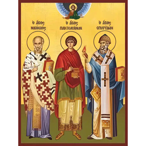 Εικόνα Ορθοδοξίας με περίγραμμα χρυσό σε ξύλο Φλαμουρίας με βάση Εικόνα ΑΓΙΟΙ ΝΙΚΟΛΑΟΣ ΑΡΧΙΕΠΙΣΚΟΠΟΣ ΜΥΡΩΝ ΛΥΚΙΑΣ, ΠΑΝΤΕΛΕΗΜΩΝ Ο ΜΕΓΑΛΟΜΑΡΤΥΣ, ΣΠΥΡΙΔΩΝ ΕΠΙΣΚΟΠΟΣ ΤΡΙΜΥΘΟΥΝΤΟΣ ΚΥΠΡΟΥ, ΟΛΟΣΩΜΟΙ Χειροποίητη Ελληνορθόδοξη εικόνα του Ιησού Χριστού, Κρεμαστή πλάκα βυζαντινής τέχνης, χριστιανική τέχνη Διάσταση 40×30 cm (10,2×7,9 ίντσες) INTRAEK-1447757865151