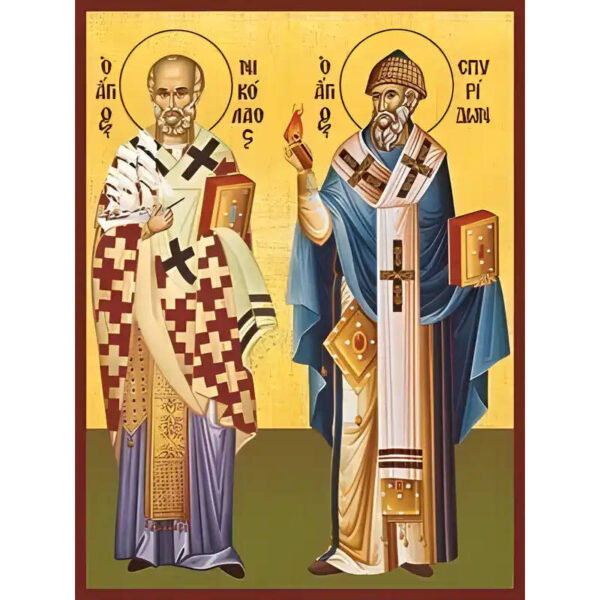 Εικόνα Ορθοδοξίας με περίγραμμα χρυσό σε ξύλο Φλαμουρίας με βάση Εικόνα ΑΓΙΟΙ ΝΙΚΟΛΑΟΣ, ΑΡΧΙΕΠΙΣΚΟΠΟΣ ΜΥΡΩΝ ΛΥΚΙΑΣ ΚΑΙ ΣΠΥΡΙΔΩΝ ΕΠΙΣΚΟΠΟΣ ΤΡΙΜΥΘΟΎΝΤΟΣ ΚΥΠΡΟΥ, ΟΛΟΣΩΜΟΙ Χειροποίητη Ελληνορθόδοξη εικόνα του Ιησού Χριστού, Κρεμαστή πλάκα βυζαντινής τέχνης, χριστιανική τέχνη Διάσταση 40×30 cm (10,2×7,9 ίντσες) INTRAEK-1447757865149