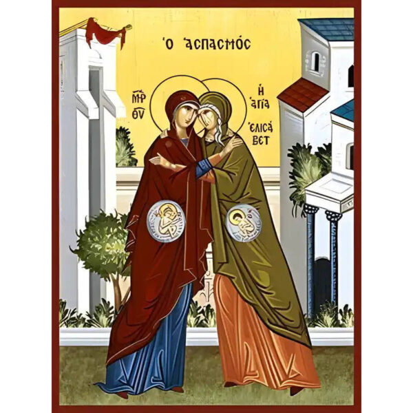 Εικόνα Ορθοδοξίας με περίγραμμα χρυσό σε ξύλο Φλαμουρίας με βάση Εικόνα ΘΕΟΤΟΚΟΣ ΚΑΙ ΑΓΙΑ ΕΛΙΣΑΒΕΤ, Ο ΑΣΠΑΣΜΟΣ Χειροποίητη Ελληνορθόδοξη εικόνα του Ιησού Χριστού, Κρεμαστή πλάκα βυζαντινής τέχνης, χριστιανική τέχνη Διάσταση 15×11 cm (5,9×4,3 ίντσες) INTRAEK-337757864410
