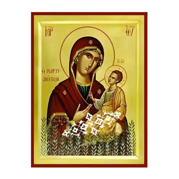 Βασικά Χαρακτηριστικά: – Σχέδιο: Κλασική βυζαντινή εικονογραφία με ζωηρό κόκκινο περίγραμμα – Υλικό: Ξύλο Μασίφ Φλαμουρία υψηλής αντοχής με προστατευτικό βερνίκι για ποιότητα που διαρκεί – Προέλευση: Χειροποίητο στην Ελλάδα – Σκοπός: Ιδανικό για γωνιές προσευχής, εκκλησίες, διακόσμηση σπιτιού ή ως δώρο με νόημα Διαθέσιμα μεγέθη: 10×7 cm (3,9 x 2,8 ίντσες) 15×11 cm (5,9 x 4,3 ίντσες) 21×15 cm (8,3 x 5,9 ίντσες) 26×20 cm (10,2 x 7,9 ίντσες) 40×30 cm (15,8 x 11,8 ίντσες) 45×35 cm (17,7 x 13,8 ίντσες) 50×40 cm (19,7 x 15,8 ίντσες)► Εικόνα της Παναγίας της Μυρτιδιώτισσας, ξύλινη.  Χειροποίητη ξύλινη εικόνα, ειδικής επεξεργασίας  σε σκληρό Φλαμουριά Ξύλο Εικόνα Ορθόδοξης τέχνης, σκαλισμένη ή τυπωμένη σε ξύλο φλαμουριάς υψηλής ποιότητας. Η φυσική απαλότητα και ομοιομορφία του ξύλου τονίζει κάθε λεπτομέρεια του εικονίσματος, αναδεικνύοντας τη βαθιά πνευματικότητα και την ιερότητα της παράδοσης. Ιδανική για οικιακό εικονοστάσι, δώρο βάπτισης, γάμου ή αφιέρωμα σε ναό. Το ξύλο έχει υποστεί ειδική επεξεργασία για αντοχή και αισθητική αρμονία, κρατώντας ζωντανά τα χρώματα και τη μορφή του προσώπου του Αγίου. με ανεξίτηλα χρώματα σε λεπτό καμβά.