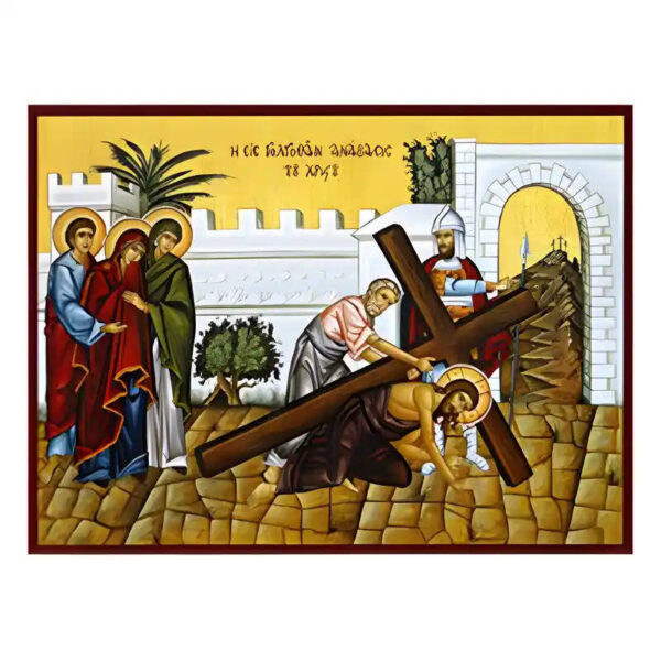 Εικόνα Ορθοδοξίας με περίγραμμα χρυσό σε ξύλο Φλαμουρίας με βάση Εικόνα Ανάβαση Κυρίου στο Γολγοθά Χειροποίητη Ελληνορθόδοξη , Κρεμαστή πλάκα βυζαντινής τέχνης, χριστιανική τέχνη Διάσταση 10×7 cm (3,9 x 2,8 ίντσες) INTRAEK-670853