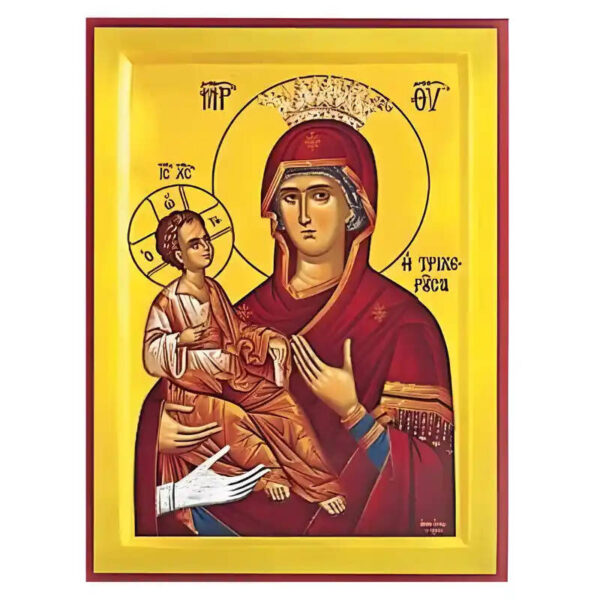 Βασικά Χαρακτηριστικά: – Σχέδιο: Κλασική βυζαντινή εικονογραφία με ζωηρό κόκκινο περίγραμμα – Υλικό: Ξύλο Μασίφ Φλαμουρία υψηλής αντοχής με προστατευτικό βερνίκι για ποιότητα που διαρκεί – Προέλευση: Χειροποίητο στην Ελλάδα – Σκοπός: Ιδανικό για γωνιές προσευχής, εκκλησίες, διακόσμηση σπιτιού ή ως δώρο με νόημα Διαθέσιμα μεγέθη: 10×7 cm (3,9 x 2,8 ίντσες) 15×11 cm (5,9 x 4,3 ίντσες) 21×15 cm (8,3 x 5,9 ίντσες) 26×20 cm (10,2 x 7,9 ίντσες) 40×30 cm (15,8 x 11,8 ίντσες) 45×35 cm (17,7 x 13,8 ίντσες) 50×40 cm (19,7 x 15,8 ίντσες)► Εικόνα της Παναγίας της Τριχερούσας, ξύλινη. Χειροποίητη ξύλινη εικόνα, ειδικής επεξεργασίας σε σκληρό Φλαμουριά Ξύλο Εικόνα Ορθόδοξης τέχνης, σκαλισμένη ή τυπωμένη σε ξύλο φλαμουριάς υψηλής ποιότητας. Η φυσική απαλότητα και ομοιομορφία του ξύλου τονίζει κάθε λεπτομέρεια του εικονίσματος, αναδεικνύοντας τη βαθιά πνευματικότητα και την ιερότητα της παράδοσης. Ιδανική για οικιακό εικονοστάσι, δώρο βάπτισης, γάμου ή αφιέρωμα σε ναό. Το ξύλο έχει υποστεί ειδική επεξεργασία για αντοχή και αισθητική αρμονία, κρατώντας ζωντανά τα χρώματα και τη μορφή του προσώπου του Αγίου. με ανεξίτηλα χρώματα σε λεπτό καμβά.