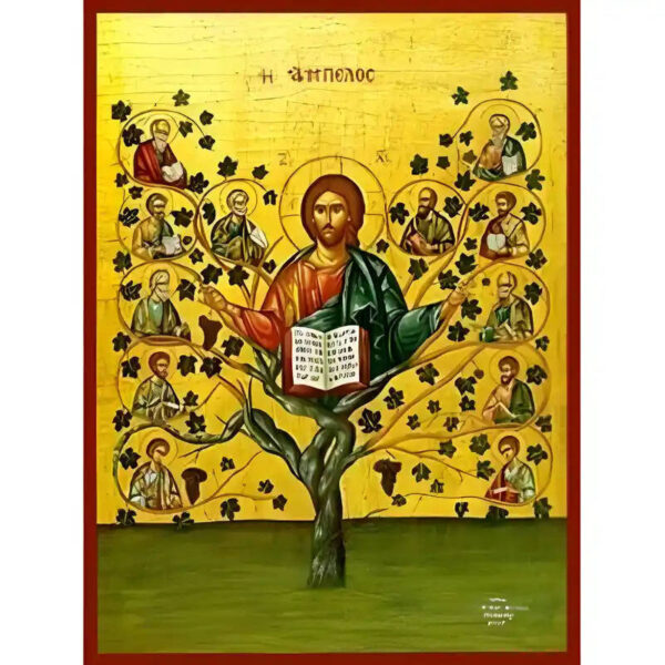 Στην άκρη των κλαδιών, τα οποία με μια έντονη καμπύλη φτιάχνουν ένα είδος θρόνου, κάθονται οι δώδεκα Απόστολοι, έξι σε κάθε πλευρά.