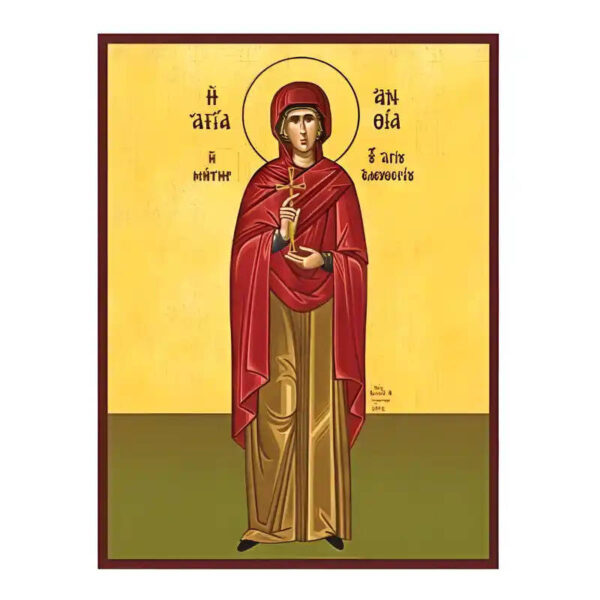 Βασικά Χαρακτηριστικά: – Σχέδιο: Κλασική βυζαντινή εικονογραφία με ζωηρό κόκκινο περίγραμμα – Υλικό: Ξύλο Μασίφ Φλαμουρία υψηλής αντοχής με προστατευτικό βερνίκι για ποιότητα που διαρκεί – Προέλευση: Χειροποίητο στην Ελλάδα – Σκοπός: Ιδανικό για γωνιές προσευχής, εκκλησίες, διακόσμηση σπιτιού ή ως δώρο με νόημα Διαθέσιμα μεγέθη: 10×7 cm (3,9 x 2,8 ίντσες) 15×11 cm (5,9 x 4,3 ίντσες) 21×15 cm (8,3 x 5,9 ίντσες) 26×20 cm (10,2 x 7,9 ίντσες) 40×30 cm (15,8 x 11,8 ίντσες) 45×35 cm (17,7 x 13,8 ίντσες) 50×40 cm (19,7 x 15,8 ίντσες)► Εικόνα της αγίας Ανθίας, ξύλινη. Χειροποίητη ξύλινη εικόνα, ειδικής επεξεργασίας σε σκληρό Φλαμουριά Ξύλο Εικόνα Ορθόδοξης τέχνης, σκαλισμένη ή τυπωμένη σε ξύλο φλαμουριάς υψηλής ποιότητας. Η φυσική απαλότητα και ομοιομορφία του ξύλου τονίζει κάθε λεπτομέρεια του εικονίσματος, αναδεικνύοντας τη βαθιά πνευματικότητα και την ιερότητα της παράδοσης. Ιδανική για οικιακό εικονοστάσι, δώρο βάπτισης, γάμου ή αφιέρωμα σε ναό. Το ξύλο έχει υποστεί ειδική επεξεργασία για αντοχή και αισθητική αρμονία, κρατώντας ζωντανά τα χρώματα και τη μορφή του προσώπου του Αγίου. με ανεξίτηλα χρώματα σε λεπτό καμβά.