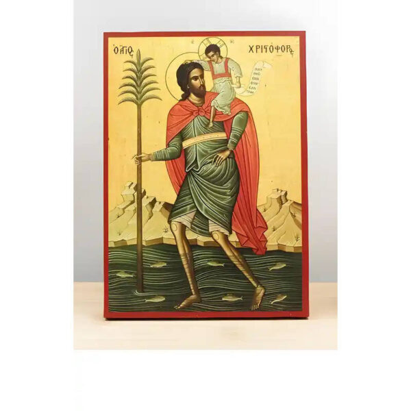 Εικόνα Ορθοδοξίας με περίγραμμα χρυσό σε ξύλο Φλαμουρίας με βάση Άγιος Χριστόφορος με τον Ιησού Χριστό, Ξύλινη Χειροποίητη Εικόνα Ελληνικού Premium Βυζαντινού Στυλ Κρεμασμένο σε ξύλινη πλάκα Θρησκευτικό θέμα Χειροποίητη Ελληνορθόδοξη εικόνα του Ιησού Χριστού, Κρεμαστή πλάκα βυζαντινής τέχνης, χριστιανική τέχνη Διάσταση 40×30 cm (15,8 x 11,8 ίντσες) INTRAEK-2111220