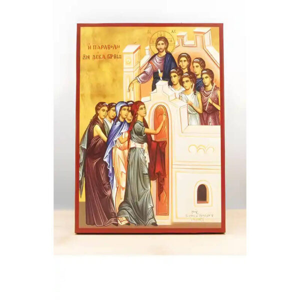 Εικόνα Ορθοδοξίας με περίγραμμα χρυσό σε ξύλο Φλαμουρίας με βάση Ιησούς Χριστός Παραβολή των Δέκα Παρθένων, Ξύλινη Χειροποίητη Εικόνα Ελληνικού Βυζαντινού Στυλ τοίχου που κρέμεται σε ξύλινη πλάκα Θρησκευτικό θέμα Χειροποίητη Ελληνορθόδοξη εικόνα του Ιησού Χριστού, Κρεμαστή πλάκα βυζαντινής τέχνης, χριστιανική τέχνη Διάσταση 40×30 cm (15,8 x 11,8 ίντσες) INTRAEK-2111170