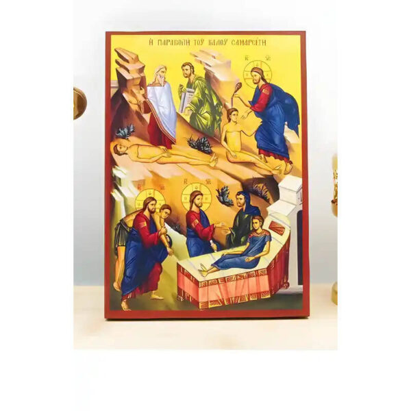 Εικόνα Ορθοδοξίας με περίγραμμα χρυσό σε ξύλο Φλαμουρίας με βάση Ιησούς Χριστός Παραβολή του Καλού Σαμαρείτη, Ξύλινη Χειροποίητη Εικόνα Ελληνικού Premium Βυζαντινού Στυλ Κρεμασμένο σε ξύλινη πλάκα Θρησκευτικό θέμα Χειροποίητη Ελληνορθόδοξη εικόνα του Ιησού Χριστού, Κρεμαστή πλάκα βυζαντινής τέχνης, χριστιανική τέχνη Διάσταση 40×30 cm (15,8 x 11,8 ίντσες) INTRAEK-2110965