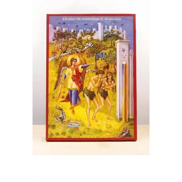Εικόνα Ορθοδοξίας με περίγραμμα χρυσό σε ξύλο Φλαμουρίας με βάση Εκδίωξη του Αδάμ και της Εύας από τον Κήπο της Εδέμ, Ξύλινη Χειροποίητη Εικόνα Ελληνικού Premium Βυζαντινού Στυλ τοίχου Κρεμασμένη σε ξύλινη πλάκα Θρησκευτικό Χειροποίητη Ελληνορθόδοξη εικόνα του Ιησού Χριστού, Κρεμαστή πλάκα βυζαντινής τέχνης, χριστιανική τέχνη Διάσταση 40×30 cm (15,8 x 11,8 ίντσες) INTRAEK-2110926