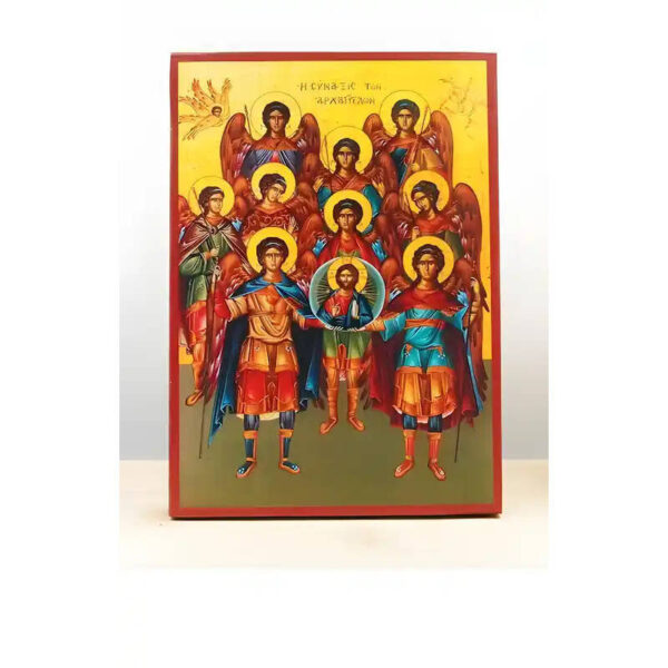 Εικόνα Ορθοδοξίας με περίγραμμα χρυσό σε ξύλο Φλαμουρίας με βάση Σύναξη Αρχαγγέλων με τον Ιησού Χριστό, Ξύλινη Χειροποίητη Εικόνα Ελληνικού Βυζαντινού Στυλ Κρεμαστή σε Ξύλινη Πλάκα Θρησκευτικό Θέμα Χειροποίητη Ελληνορθόδοξη εικόνα του Ιησού Χριστού, Κρεμαστή πλάκα βυζαντινής τέχνης, χριστιανική τέχνη Διάσταση 40×30 cm (15,8 x 11,8 ίντσες) INTRAEK-2110806