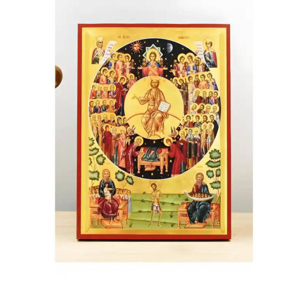 Εικόνα Ορθοδοξίας με περίγραμμα χρυσό σε ξύλο Φλαμουρίας με βάση Γιορτή των Αγίων Πάντων, Ξύλινη Χειροποίητη Εικόνα Ελληνικού Premium Βυζαντινού Στυλ Κρεμασμένο σε ξύλινη πλάκα Θρησκευτικό θέμα Χειροποίητη Ελληνορθόδοξη εικόνα του Ιησού Χριστού, Κρεμαστή πλάκα βυζαντινής τέχνης, χριστιανική τέχνη 45×35 cm (17,7 x 13,8 ίντσες) INTRAEK-342111190