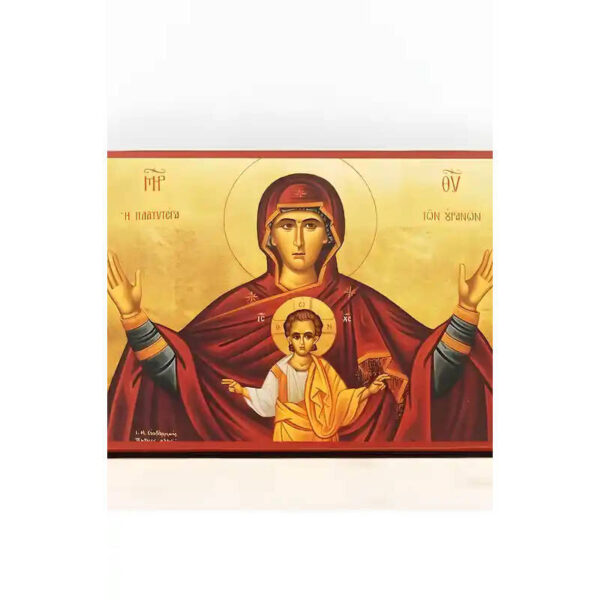 Εικόνα Ορθοδοξίας με περίγραμμα χρυσό σε ξύλο Φλαμουρίας με βάση Παναγία Πιο ευρύχωρη και από τους ουρανούς «Πλατυτέρα», Ξύλινη Χειροποίητη Εικόνα Ελληνικού Premium Βυζαντινού Στυλ Κρεμασμένο σε ξύλινη πλάκα Χειροποίητη Ελληνορθόδοξη εικόνα του Ιησού Χριστού, Κρεμαστή πλάκα βυζαντινής τέχνης, χριστιανική τέχνη 45×35 cm (17,7 x 13,8 ίντσες) INTRAEK-342111080