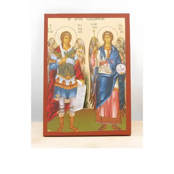 Εικόνα Ορθοδοξίας με περίγραμμα χρυσό σε ξύλο Φλαμουρίας με βάση Αρχάγγελοι Μιχαήλ και Γαβριήλ «Ταξιάρχες», Ξύλινη Χειροποίητη Εικόνα μεΨηφιακή Εκτύπωση Ελληνικής Βυζαντινής τεχνοτροπίας Κρεμασμένη σε ξύλινη πλάκα Χειροποίητη Ελληνορθόδοξη εικόνα του Ιησού Χριστού, Κρεμαστή πλάκα βυζαντινής τέχνης, χριστιανική τέχνη 45×35 cm (17,7 x 13,8 ίντσες) INTRAEK-342111052