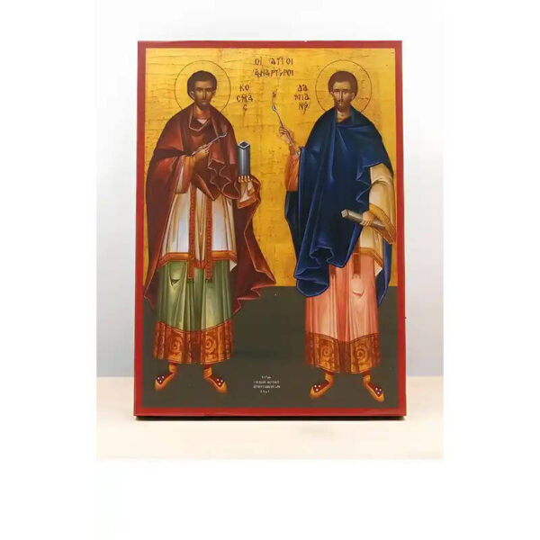 Εικόνα Ορθοδοξίας με περίγραμμα χρυσό σε ξύλο Φλαμουρίας με βάση Άγιοι Άγιοι Ανεργοφόροι Κοσμάς και Δαμιανός, Ξύλινη Χειροποίητη Εικόνα Ελληνικού Βυζαντινού Στυλ Κρεμαστό σε ξύλινη πλάκα Χειροποίητη Ελληνορθόδοξη εικόνα του Ιησού Χριστού, Κρεμαστή πλάκα βυζαντινής τέχνης, χριστιανική τέχνη 45×35 cm (17,7 x 13,8 ίντσες) INTRAEK-342111029