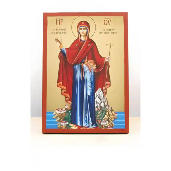 Εικόνα Ορθοδοξίας με περίγραμμα χρυσό σε ξύλο Φλαμουρίας με βάση Παναγία η Προστάτιδα του Αγίου Όρους, Ξύλινη Χειροποίητη Εικόνα με Ψηφιακή Εκτύπωση Ελληνικού Βυζαντινού Στυλ επιτοίχιας υψηλής ποιότητας Χειροποίητη Ελληνορθόδοξη εικόνα του Ιησού Χριστού, Κρεμαστή πλάκα βυζαντινής τέχνης, χριστιανική τέχνη 45×35 cm (17,7 x 13,8 ίντσες) INTRAEK-342111007