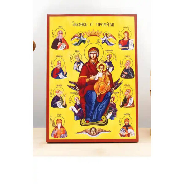 Εικόνα Ορθοδοξίας με περίγραμμα χρυσό σε ξύλο Φλαμουρίας με βάση Η Παναγία με τον Ιησού τους Προφήτες από πάνω, Ξύλινη Χειροποίητη Εικόνα Ελληνικού Premium Βυζαντινού Στυλ τοίχου Κρεμασμένη σε ξύλινη πλάκα Θρησκευτικό Χειροποίητη Ελληνορθόδοξη εικόνα του Ιησού Χριστού, Κρεμαστή πλάκα βυζαντινής τέχνης, χριστιανική τέχνη 45×35 cm (17,7 x 13,8 ίντσες) INTRAEK-342110940