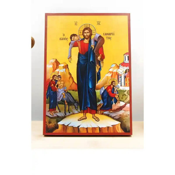 Εικόνα Ορθοδοξίας με περίγραμμα χρυσό σε ξύλο Φλαμουρίας με βάση Παράσταση Ιησούς Χριστός ο Καλός Σαμαρείτης, Ξύλινη Χειροποίητη Εικόνα Ελληνικού Βυζαντινού Στυλ Κρεμαστή σε ξύλινη πλάκα Θρησκευτικό Χειροποίητη Ελληνορθόδοξη εικόνα του Ιησού Χριστού, Κρεμαστή πλάκα βυζαντινής τέχνης, χριστιανική τέχνη Δίασταση 50×40 cm (19,7 x 15,8) INTRAEK-11342110901