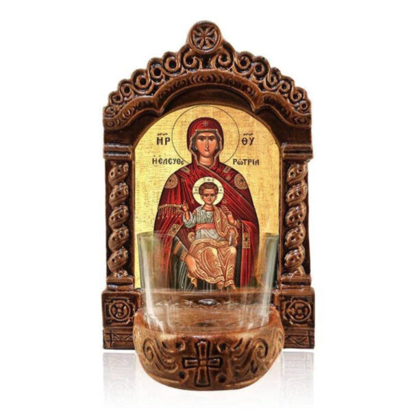 Εικόνα Ορθοδοξίας με περίγραμμα χρυσό σε ξύλο Φλαμουρίας με βάση Παναγία της Ελευθερώτριας Λυχνία, Παναγία η λυτρωτής Κεραμική επιτραπέζια εικόνα, Παναγία Ελευθερώτρια Αγρυπνία με κύπελλο Διάσταση 10×7 cm (3,9 x 2,8 ίντσες) INTRAEK-816723922