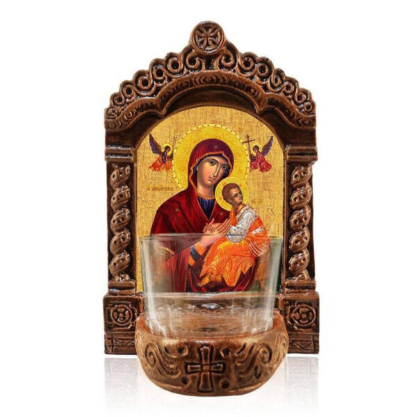 Εικόνα Ορθοδοξίας με περίγραμμα χρυσό σε ξύλο Φλαμουρίας με βάση Παναγία η Αμόλυντη Λυχνία, Παναγία η Άμωμη Κεραμική Επιτραπέζια Εικόνα, Παναγία Οδηγήτρια Αγρυπνία με Κύπελλο Διάσταση 10×7 cm (3,9 x 2,8 ίντσες) INTRAEK-816723844
