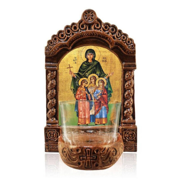 Εικόνα Ορθοδοξίας με περίγραμμα χρυσό σε ξύλο Φλαμουρίας με βάση Φωτιστικό Αγρυπνίας Αγίας Σοφίας, Αγία Σοφία με τις κόρες της Πίστη Ελπίδα και Αγάπη, Χειροποίητο Κεραμικό Φωτιστικό Αγρυπνίας με Γυάλινο Κύπελλο Διάσταση 15×11 cm (5,9 x 4,3 ίντσες) INTRAEK-16724160