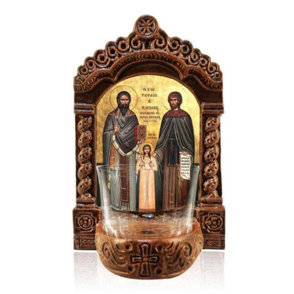 Αυτό το εξαιρετικό κεραμικό φωτιστικό αγρυπνίας με τους Αγίους Ραφαήλ, Νικόλαο και Ειρήνη είναι ένα εκπληκτικό κομμάτι χειροποίητης τέχνης. Σχεδιασμένο για να μοιάζει με τρούλο εκκλησίας, περιλαμβάνει λεπτομερείς περιστρεφόμενες στήλες που οδηγούν σε μια περίτεχνη κορυφή με τρούλο. Στο κέντρο του, μια βυζαντινή λιθογραφία των Αγίων Ραφαήλ, Νικολάου και Ειρήνης υπερηφανεύεται για τη θέση του, ενώ στη βάση υπάρχει ένα κηροπήγιο στολισμένο με εγχάρακτο σταυρό.