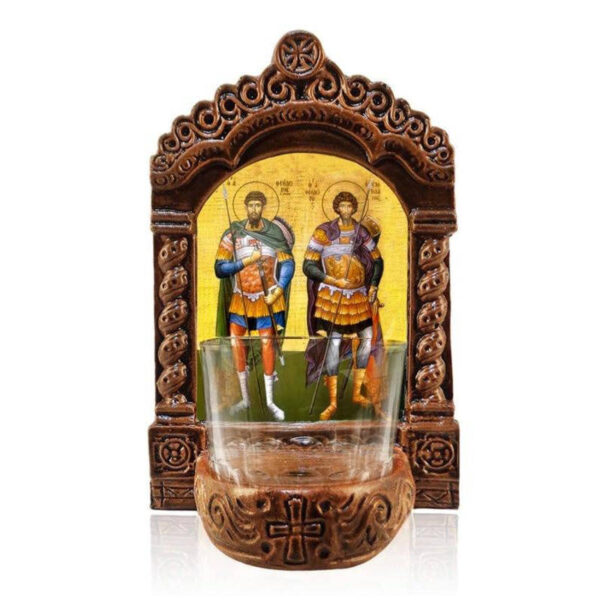 Εικόνα Ορθοδοξίας με περίγραμμα χρυσό σε ξύλο Φλαμουρίας με βάση Λάμπα Αγρυπνίας Αγίων Θεοδώρων, Αγίων Θεοδώρων ο Στρατηλάτης και Θεόδωρος ο Στρατηγός, Χειροποίητο Κεραμικό Φωτιστικό Αγρυπνίας με Γυάλινο Κύπελλο Διάσταση 15×11 cm (5,9 x 4,3 ίντσες) INTRAEK-16723894