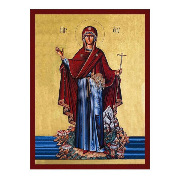 Ιδανική για χώρους προσευχής, διακόσμηση εκκλησιών ή ως δώρο με νόημα, αυτή η εικόνα αντικατοπτρίζει τη βαθιά πνευματική σύνδεση μεταξύ της Θεοτόκου και του Αγίου Όρους, εμπνέοντας αφοσίωση και εμπιστοσύνη στη στοργική φροντίδα της.