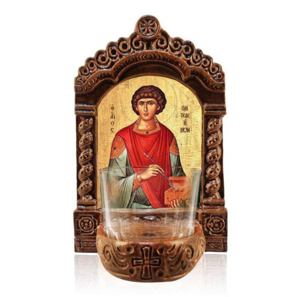 Εικόνα Ορθοδοξίας με περίγραμμα χρυσό σε ξύλο Φλαμουρίας με βάση Αγρυπνός Αγίου Παντελεήμονα, Άγιος Παντελεήμονας ο Μεγαλομάρτυρας Ελληνικής κατασκευής Επιτραπέζια εικόνα, Χειροποίητο Κεραμικό Φανάρι με Γυάλινο Κύπελλο Διάσταση 15×11 cm (5,9 x 4,3 ίντσες) INTRAEK-16723876