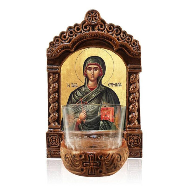 Εικόνα Ορθοδοξίας με περίγραμμα χρυσό σε ξύλο Φλαμουρίας με βάση Αγρυπνός Αγρυπνίας Αγίας Ευφημίας, Αγία Ευφημία η Μεγαλομάρτυς Ελληνική Επιτραπέζια Εικόνα, Χειροποίητο Κεραμικό Φωτιστικό Αγρυπνίας με Γυάλινο Κύπελλο Διάσταση 15×11 cm (5,9 x 4,3 ίντσες) INTRAEK-16723781