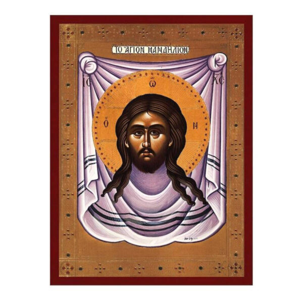 Αυτή η όμορφη βυζαντινή ξύλινη εικόνα του Αγίου Μανδυλίου αντιπροσωπεύει ένα από τα πιο σεβαστά κειμήλια της χριστιανικής παράδοσης, που απεικονίζει τη θαυματουργή εικόνα του προσώπου του Χριστού αποτυπωμένη σε ένα ύφασμα. Αυτή η ιερή εικόνα, γνωστή και ως «Εικόνα Φτιαγμένη Χωρίς Χέρια», συμβολίζει τη θεία παρουσία του Χριστού και το δώρο Του της ελπίδας και της σωτηρίας.