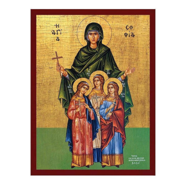 Αυτή η όμορφη βυζαντινή ξύλινη εικόνα της Αγίας Σοφίας (η μάρτυς Σοφία και οι τρεις κόρες της στη Ρώμη) τιμά την αγία μάρτυρα και την ακλόνητη πίστη της στον Χριστό. Συνοδευόμενη από τις τρεις κόρες της—Πίστη, Ελπίδα και Αγάπη—η Αγία Σοφία ενσαρκώνει τις αρετές του θάρρους, της σοφίας και της ακλόνητης αφοσίωσης στον Θεό, ακόμη και ενόψει της δίωξης.
