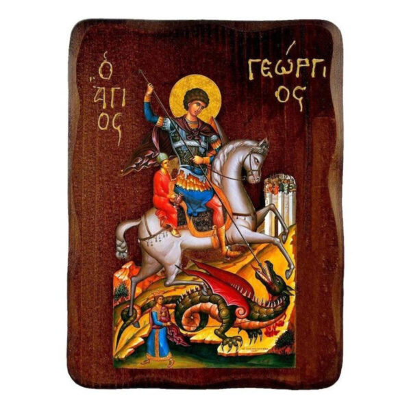 Αυτή η όμορφα φιλοτεχνημένη εικόνα του Αγίου Γεωργίου είναι κατασκευασμένη από φυσικό ξύλο λεύκας, επιδεικνύοντας περίπλοκη λιθογραφική τέχνη. Το ξύλο διαθέτει μια μοναδική κυματιστή άκρη που προσθέτει μια μοντέρνα πινελιά στο κομμάτι.