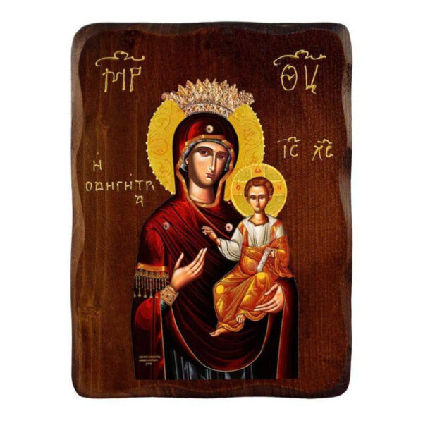 Αυτή η όμορφα φιλοτεχνημένη εικόνα της Παναγίας της Οδηγήτριας, γνωστής και ως Οδηγήτρια Μητέρα, είναι φτιαγμένη από φυσικό ξύλο λεύκας, επιδεικνύοντας περίπλοκη λιθογραφική τέχνη. Οι κυματιστές άκρες του ξύλου προσθέτουν μια σύγχρονη και κομψή πινελιά σε αυτό το ιερό κομμάτι.