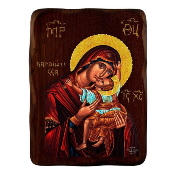Αυτή η εξαιρετικά φιλοτεχνημένη εικόνα της Παναγίας της Καρδιώτισσας, γνωστής και ως Παναγία της Καρδιάς, είναι κατασκευασμένη από φυσικό ξύλο λεύκας, με λεπτομερή λιθογραφική τέχνη. Οι κυματιστές άκρες του ξύλου προσθέτουν μια σύγχρονη και κομψή πινελιά σε αυτό το ιερό κομμάτι.