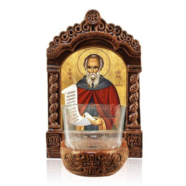 Αυτή η εξαιρετική κεραμική λάμπα αγρυπνίας με τον Άγιο Σάββα είναι ένα εκπληκτικό κομμάτι χειροποίητης τέχνης. Σχεδιασμένο για να μοιάζει με τρούλο εκκλησίας, περιλαμβάνει λεπτομερείς περιστρεφόμενες στήλες που οδηγούν σε μια περίτεχνη κορυφή με τρούλο. Στο κέντρο του, μια βυζαντινή λιθογραφία του Αγίου Σάββα υπερηφανεύεται για τη θέση του, ενώ στη βάση υπάρχει ένα κηροπήγιο στολισμένο με εγχάρακτο σταυρό.