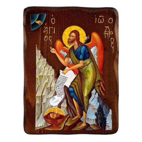 Ιδανικό για επιτοίχια ή επίδειξη, αυτό το εικονίδιο συμβολίζει τη μετάνοια, την προφητεία και την προετοιμασία.
