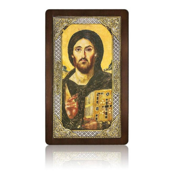 Αυτή η απεικόνιση του Χριστού, γνωστή ως «Παντοκράτορας» (Ο Παντοδύναμος), προέρχεται από την περίφημη εικόνα που βρέθηκε στη Μονή της Αγίας Αικατερίνης στο όρος Σινά. Η εικόνα του Παντοκράτορα είναι μια από τις πιο σημαντικές και σεβαστές εικόνες στη χριστιανική τέχνη, που συμβολίζει τον Χριστό ως τον παντοδύναμο και αιώνιο άρχοντα του σύμπαντος. Η εικόνα απεικονίζει τον Χριστό με μια επιβλητική παρουσία, αντιπροσωπεύοντας τόσο τη θεία όσο και την ανθρώπινη φύση Του. Το βλέμμα Του είναι δυνατό, ακτινοβολεί αυθεντία, ενώ το χέρι που υψώνεται για ευλογία τονίζει τον ρόλο Του ως αιώνιου κυρίαρχου.