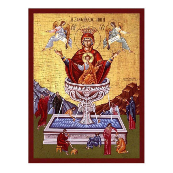 Αυτή η όμορφη βυζαντινή ξύλινη εικόνα της Παναγίας της Ζωοδόχου Πηγής (Η Ζωοδόχος Πηγή) απεικονίζει την Παναγία ως πηγή θεραπείας, ελπίδας και θείας χάρης. Σεβαστή για τις θαυματουργές μεσιτείες της, αυτός ο τίτλος της Θεοτόκου προέρχεται από το ιστορικό μοναστήρι της Ζωοδόχου Πηγής στην Κωνσταντινούπολη, όπου αμέτρητοι πιστοί έχουν ζητήσει τις ευλογίες της και έχουν βιώσει τη συμπονετική της φροντίδα.