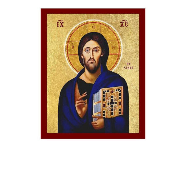 Αυτή η μοναδική εκδοχή της εικόνας του Ιησού Χριστού του Σινά παρουσιάζει τον Χριστό με έντονα μπλε ενδύματα, μεταφέροντας τόσο θεϊκό μεγαλείο όσο και βαθιά γαλήνη. Εμπνευσμένη από τη διαχρονική εικόνα του 6ου αιώνα από τη Μονή της Αγίας Αικατερίνης στο όρος Σινά, αυτή η απόδοση προσφέρει μια αναζωογονητική, φωτεινή ερμηνεία του κλασικού Παντοκράτορα.