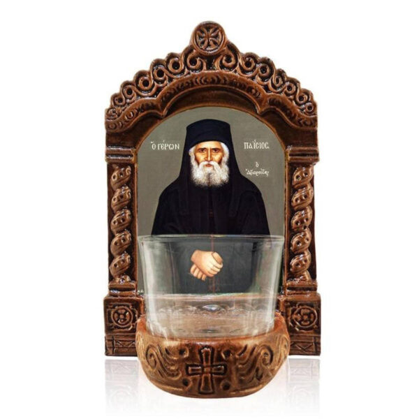 Εικόνα Ορθοδοξίας με περίγραμμα χρυσό σε ξύλο Φλαμουρίας με βάση Φωτιστικό Αγρυπνίας Αγίου Παΐσιου, Επιτραπέζια εικόνα Πατήρ Παΐσιος ο Αθωνίτης, Χειροποίητο Κεραμικό Φωτεινό με γυάλινο κύπελλο Διάσταση 45×35 cm (17,7 x 13,8 ίντσες) INTRAEK-543216724163