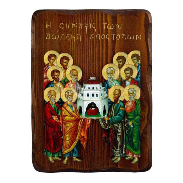 Εικόνα Ορθοδοξίας με περίγραμμα χρυσό σε ξύλο Φλαμουρίας με βάση Εικόνα Σύναξη των Αγίων Δώδεκα Αποστόλων, Χειροποίητη Ελληνική εικόνα Σύναξις, επιτοίχια βυζαντινή τέχνη, θρησκευτικό δώρο, χριστιανική διακόσμηση Διάσταση 45×35 cm (17,7 x 13,8 ίντσες) INTRAEK-543216723972